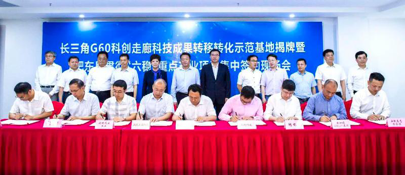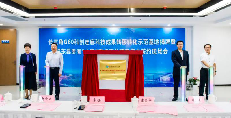 6月10日上午,长三角G60科创走廊科技成果转移转化示范基地(合肥)揭牌暨肥东县贯彻“六稳”重点产业项目集中签约现场会在肥东县长临河科创小镇举行。省委常委、省委宣传部部长、市委书记虞爱华出席,为基地揭牌并见证签约。上海市松江区区长李谦致辞并一同为基地揭牌,上海市松江区政协副主席赵宏卫;市长凌云,市领导韦弋、王文松,市政府秘书长罗平;G60联席办、部分高校和省直有关部门负责人出席现场会。其中省发改委、省科技厅、省经信厅、市发改委、市科技局、市经信委、市投促局、市国资委、兴泰集团、产投集团、合肥城建、交易集团、中国科技大学、合肥工业大学等相关部门及高校受邀并出席本次授牌仪式