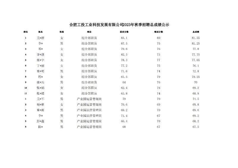 合肥工投工业科技发展有限公司2023年秋季招聘总成绩公示