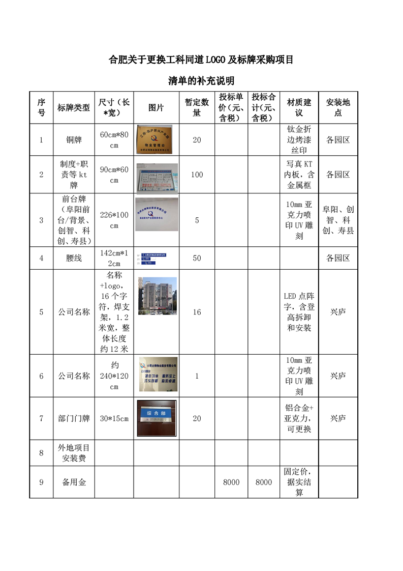 合肥关于更换工科同道LOGO及标牌采购项目清单的补充说明