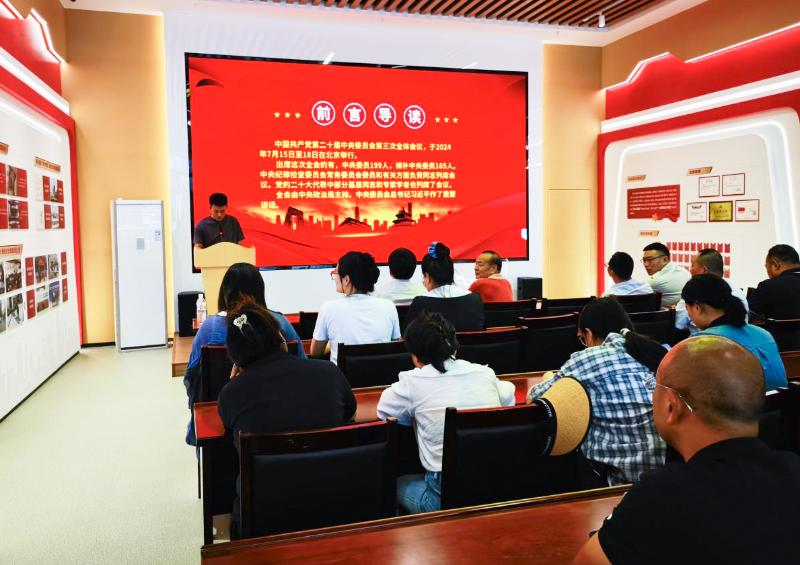 参观活动结束后,大家回到第三党支部党员活动室,集中学习了习近平总书记在纪念邓小平同志诞辰120周年座谈会上的重要讲话精神。第三党支部发展对象杜凯同志其次进行学习贯彻党的二十届三中全会精神“思政微党课”的宣讲。
