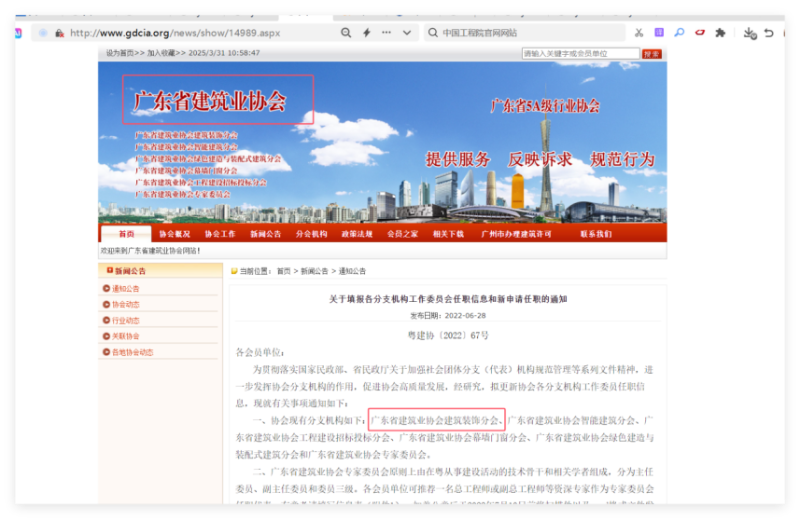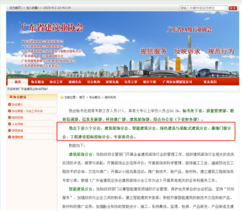 广东省建筑业协会建筑装饰分会为广东省建筑业协会内部下属分会,并不具备独立的法人资格并依法登记注册,因此在“全国社会组织信用信息公示平台”上查询不到,类似情况全国建设工程安全生产标准化工地学习交流项目荣誉由中国建筑业协会建筑安全与机械分会颁发,中国建筑业协会建筑安全与机械分会是中国建筑业协会内部下属分会,在“全国社会组织信用信息公示平台”上也查询不到。